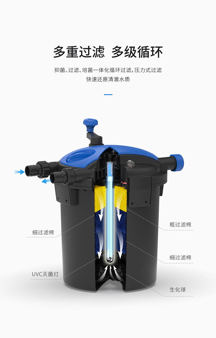 內(nèi)置式紫外線燈,能有效地殺死水中的藻類、病毒及有害菌;